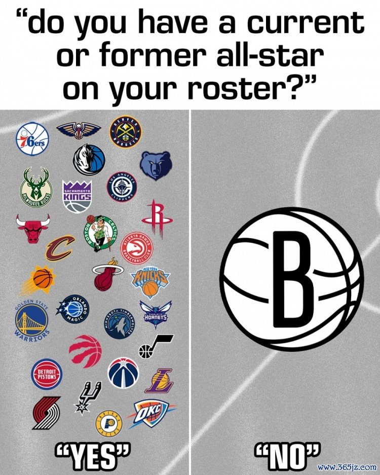 10月2日讯 美媒Buckets统计,新赛季的篮网队是联盟唯一一支队中球员都没有明星赛经历的球队。