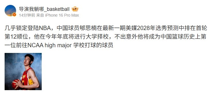 8月29日讯 美媒NBA Draft Room近日更新了2028届球员的模拟球员选拔。其中,中国球员郇斯楠位列第12顺位。
