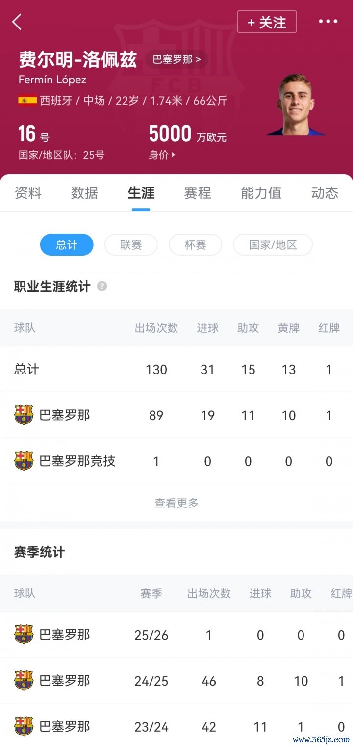 22岁的费尔明出自巴萨青训,截至目前共为巴萨一线队出场89次,打入19球11助功 ,他的德回转 价为5000万欧元。