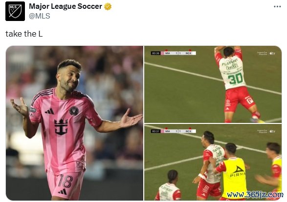 美职联的官方社媒晒出组图, 西甲直播平台分别是拿加沙球员里卡多得分 后siu庆祝, 大家运动家园和迈阿密绝平球员阿尔巴的嚣张摊手图。美职联官方配文:“take the L”,搏击资讯意为:接受失败吧。