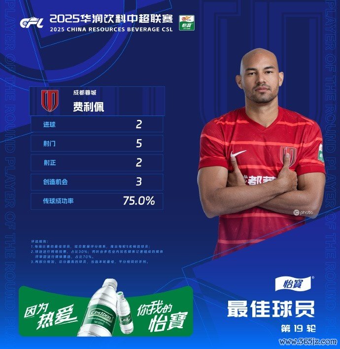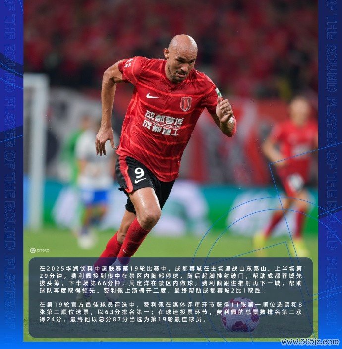 8月5日讯 官方消息,成都蓉城前场球员费利佩-席尔瓦当选中超第19轮最佳球员。