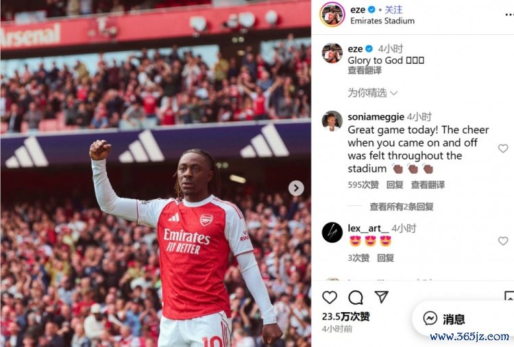9月14日讯 在阿森纳3-0诺丁汉森林的赛后,阿森纳球员埃泽更新社交媒体。