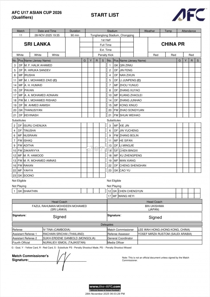 11月28日讯 U17亚洲杯预选赛A组第4轮,U16国足vs斯里兰卡U16,赛前双方杆位公布。