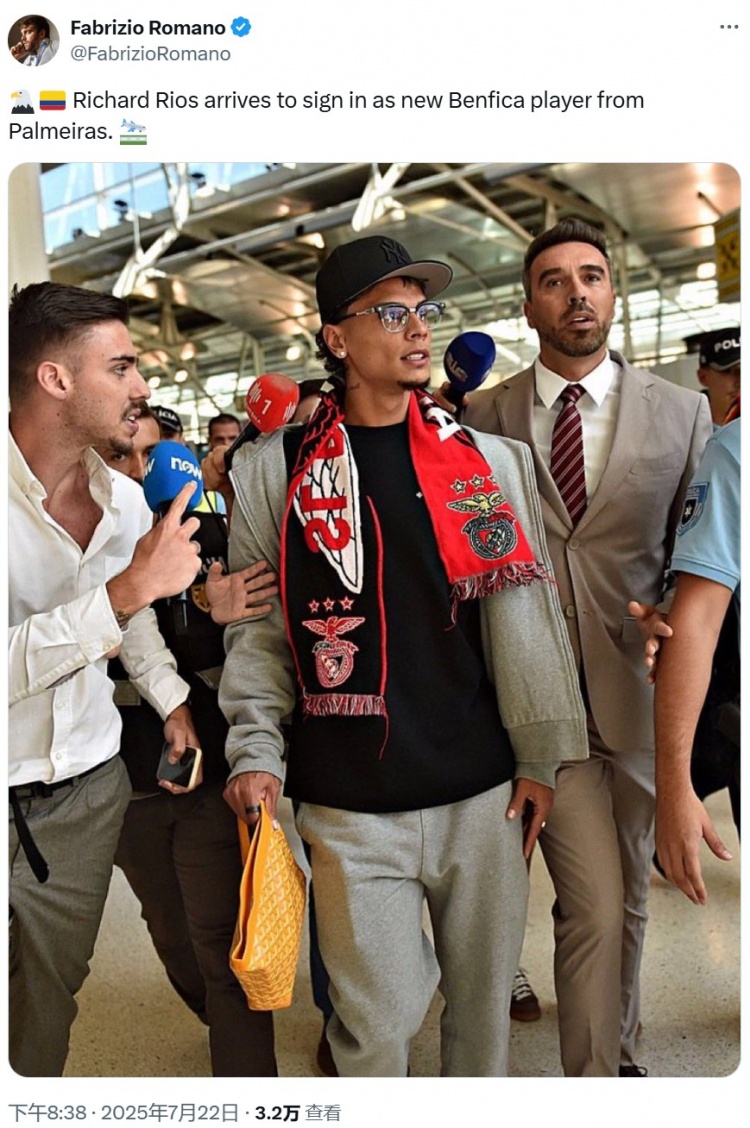 罗马诺在社交媒体上晒出里奥斯戴着本菲卡围巾的照片,搏击资讯法甲直播并配文写道:“理查德-里奥斯抵达(里斯本)欧冠冠军, 西甲以完成从帕尔梅拉斯转会至本菲卡的签约。”