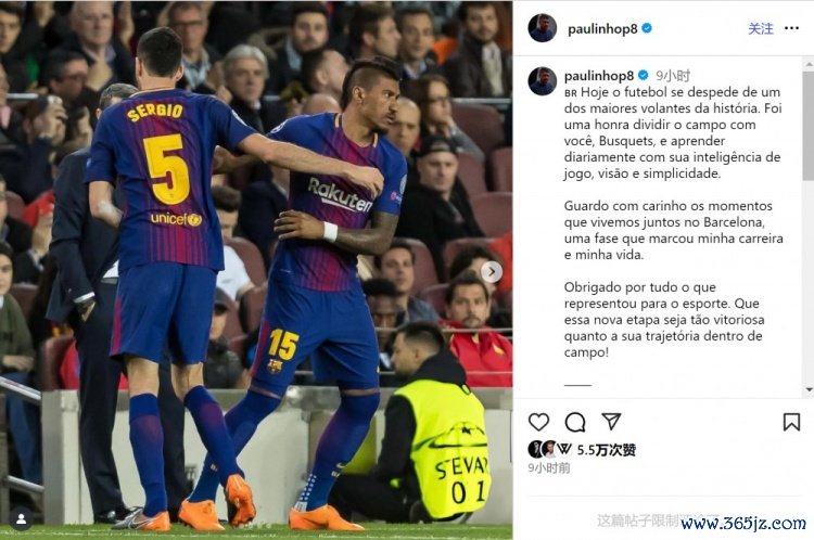 9月27日讯 布斯克茨宣布在本赛季结束后退役,前巴萨队友保利尼奥社媒发文致敬。