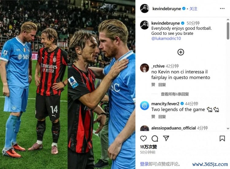 9月29日讯 在对阵AC米兰的赛事 后,那不勒斯中场球员德布劳内在社交媒体上传了与莫德里奇的合影。