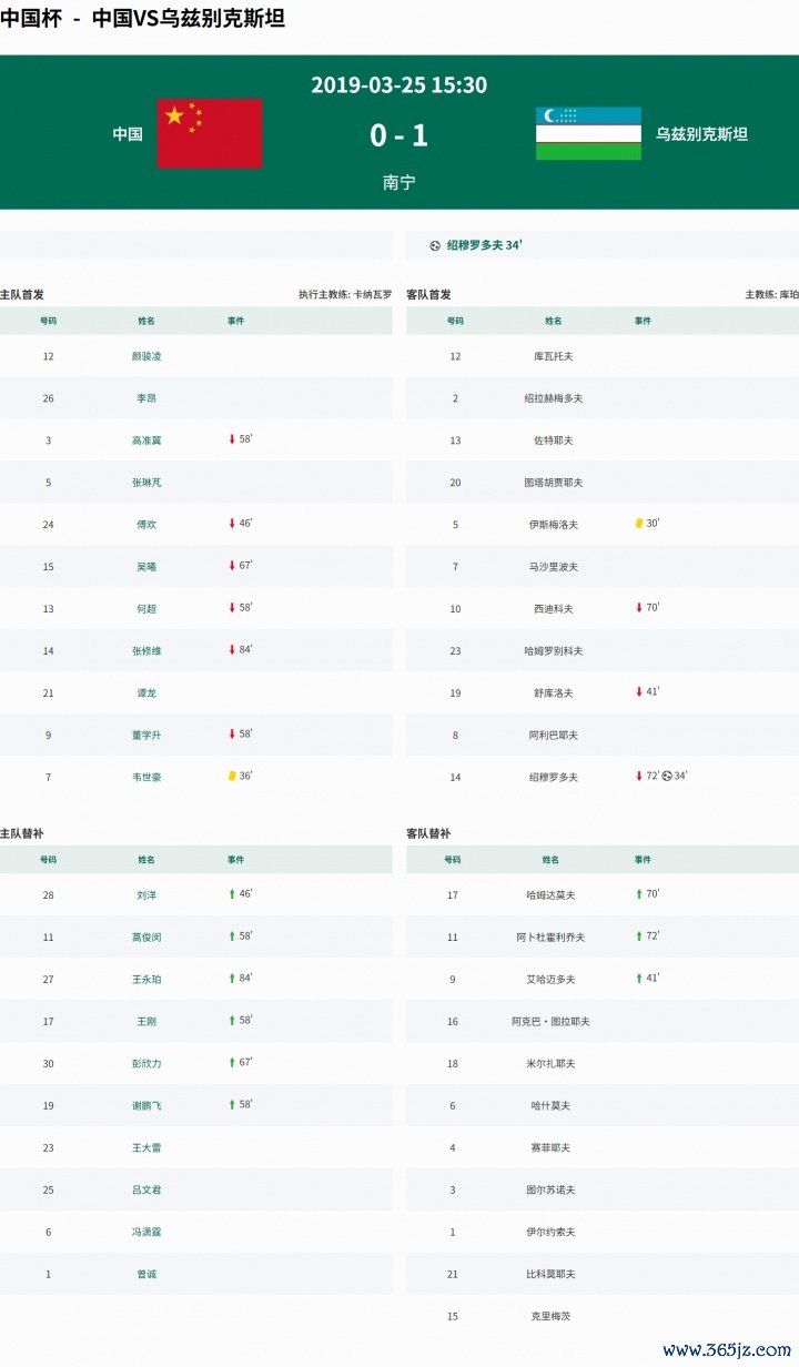 2019年3月25日,第三届中国杯第三名 争夺战在中国队和乌兹别克斯坦之间进行。上半场国足攻击 端毫无亮点,搏击资讯绍穆罗多夫爆射破门, 西甲高清直播韦世豪凶狠飞铲染黄, 大家运动家园下半场对方错失多次良机。最终国足0-1不敌乌兹别克斯坦,当届中国杯两连败且一球未进,排名垫底。