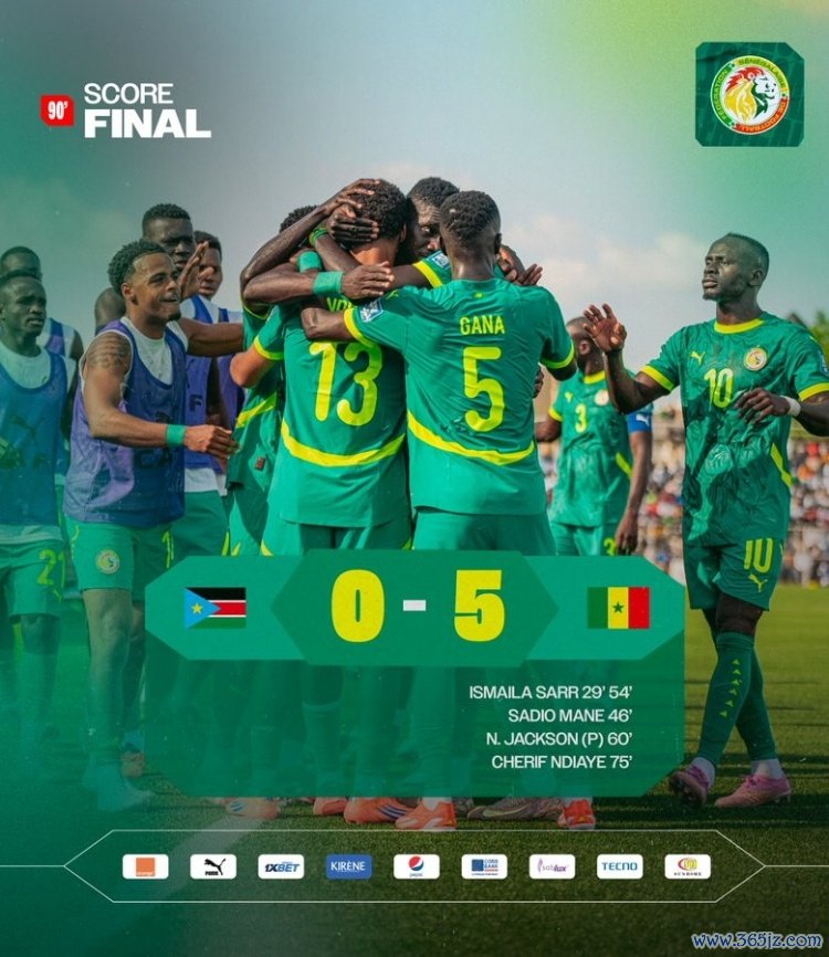 10月10日讯 在2026年世界杯赛 预选赛中,塞内加尔队5-0大胜南苏丹,晋级下一轮 在望。