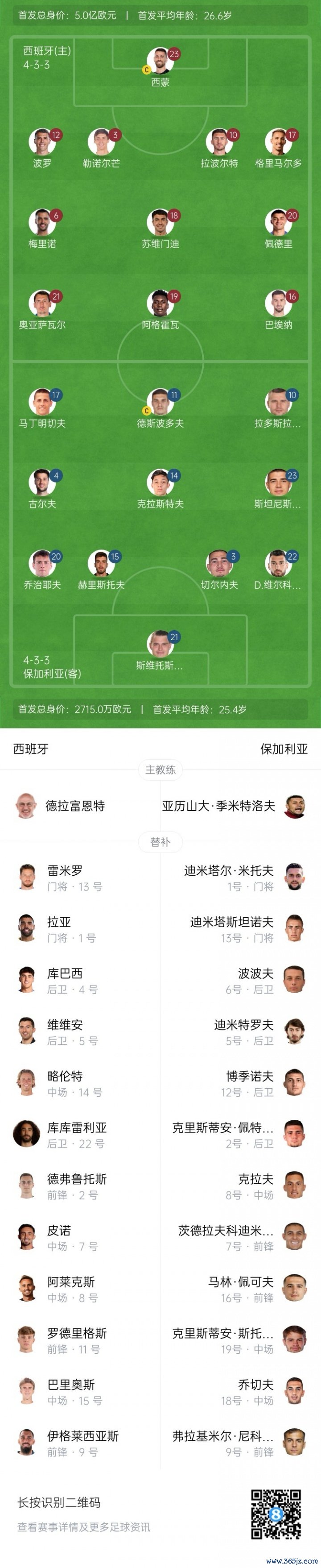 西班牙vs保加利亚杆位:佩德里先发,拉波尔特、巴埃纳出战