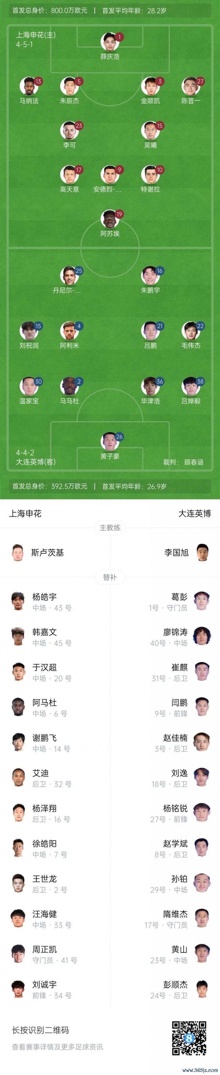 申花vs大连杆位:高天意、李可、阿苏埃先发,刘祝润、朱鹏宇出战