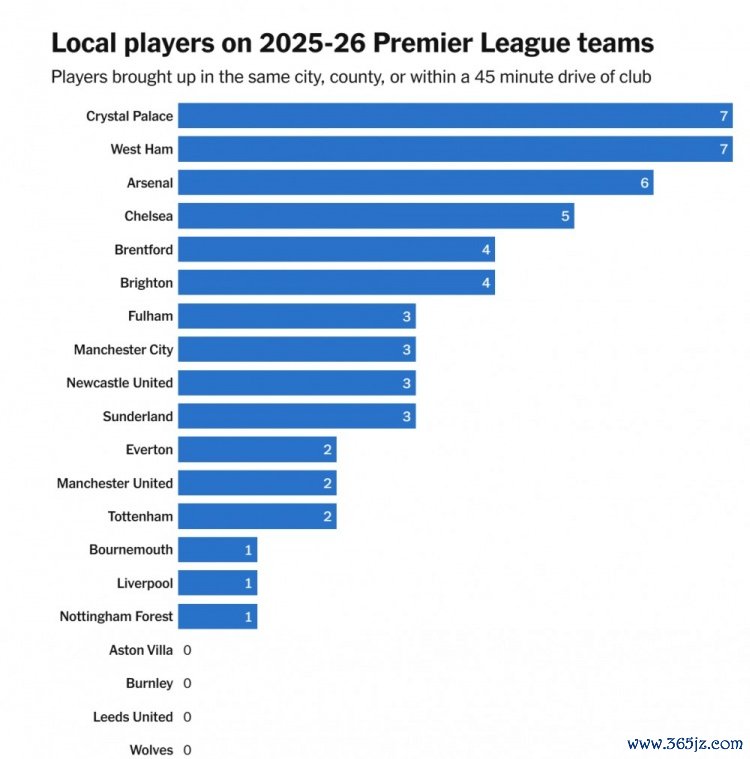2025-26赛季,搏击资讯足球直播英超职业联赛 平均每支球队仅有2.7名本地球员。维拉、利兹联、狼队和伯恩利均无本地球员, 西甲而诺丁汉森林、利物浦和伯恩茅斯三支球队则只有1名本地球员。