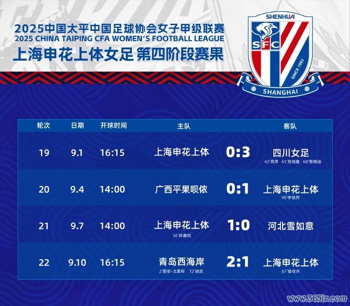 9月10日,2025中国太平中国足协女甲职业联赛 (第四阶段)第22轮战罢。申花上体女足在本阶段赛事 中致胜球 领头羊广西平果呗侬、力克河北雪如意,负于积分榜第二的四川女足和第三的青岛西海岸,搏击资讯在线直播4战2胜2负,