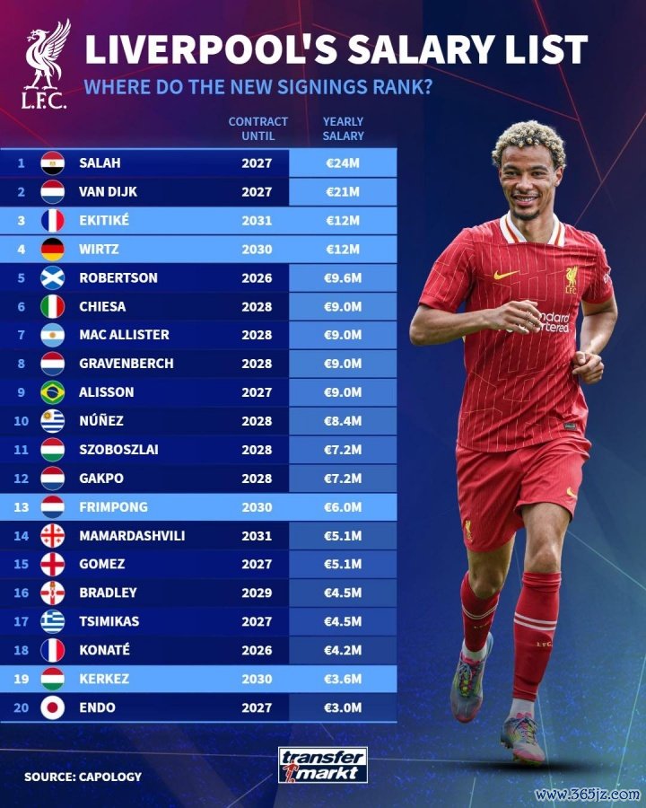 08月04日讯 近日,德转根据著名古代足球 金融机构capology的数据,列出了利物浦目前队内的薪资排行,搏击资讯直播平台其中新援埃基蒂克和维尔茨以1200万欧年薪并列第3, 西甲弗林蓬600万欧位列第13, 大家运动家园科尔克兹仅列第19。