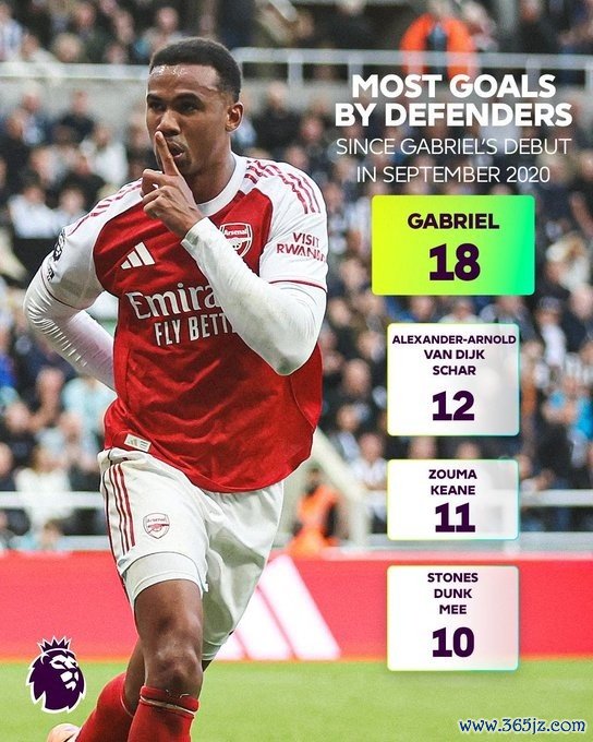 西甲高清直播阿森纳后场球员加布里埃尔已成为同期职业联赛 中得分 最多的后场球员,