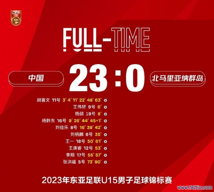 2023年,东亚足联U15男子古代足球 冠军赛 ,中国23-0北马里亚纳群岛