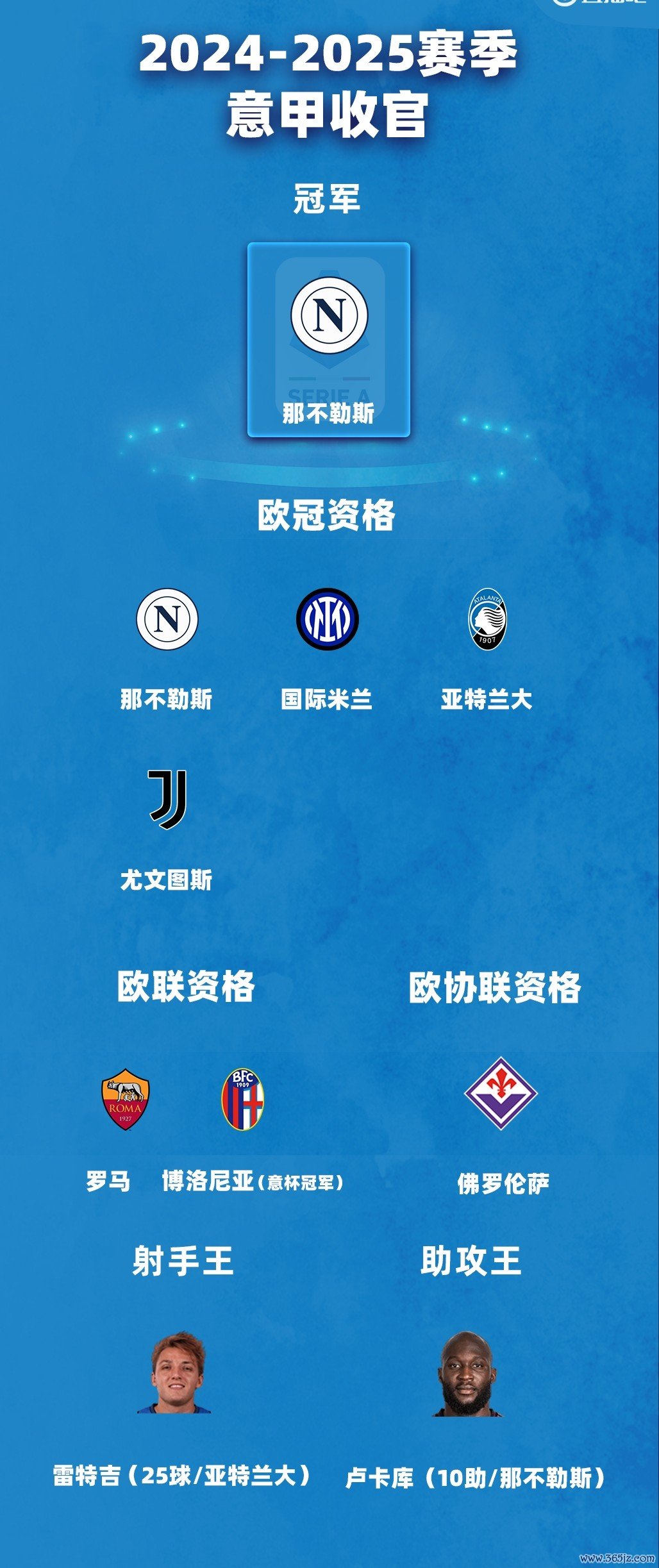 500体育5月26日讯 意甲第38轮结束全部赛事 ,尤文获得下赛季欧冠席位。本赛季意甲,那不勒斯以82分夺得第一名 足球竞猜,国米、亚特兰大和尤文分列2-4名足球竞猜,搏击资讯获得欧冠资格。第五的罗马和意大利杯第一名 博洛尼亚获得欧联杯资格,