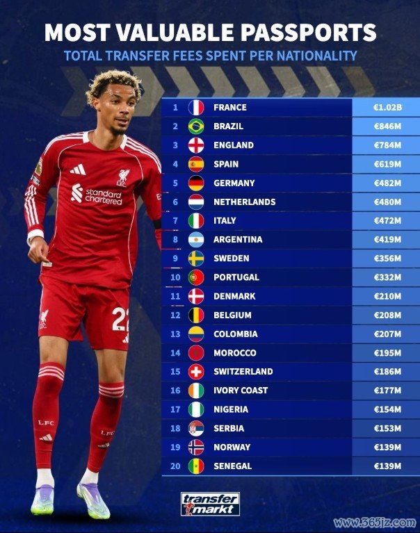在刚刚过去的2025夏窗,法国球员的转会身价总和超过了10亿欧元,超过了巴西、阿根廷、德国和英格兰,高卢军团或许已经成为了实际意义上的古代足球 王国。