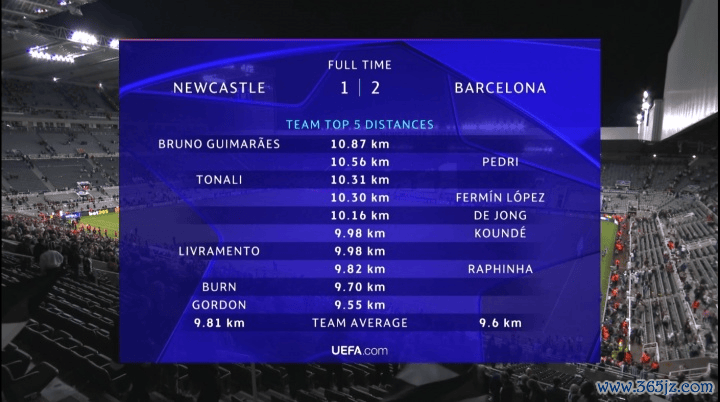 巴萨2-1纽卡移动距离 : 吉马良斯10.87km全场最多, 佩德里第2
