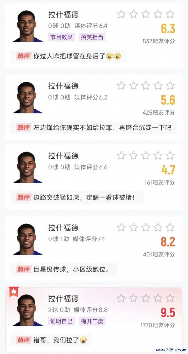 拉什福德巴萨5场赛事 评分,从上至下分别是西甲1-4轮和欧冠首轮