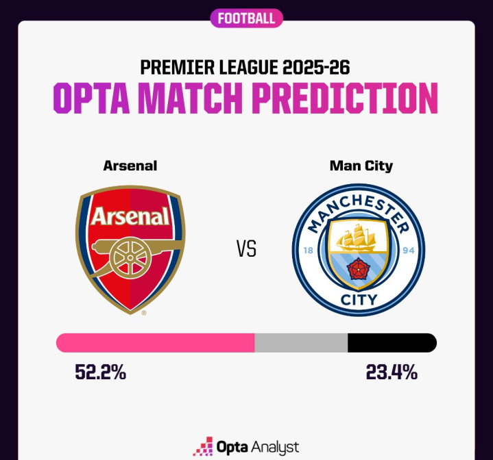 所以,在本场的预测中,Opta将更多的支持给予了主队--阿森纳胜,52.2%;曼城胜,搏击资讯23.4%;双方平手 , 西甲24.4%。