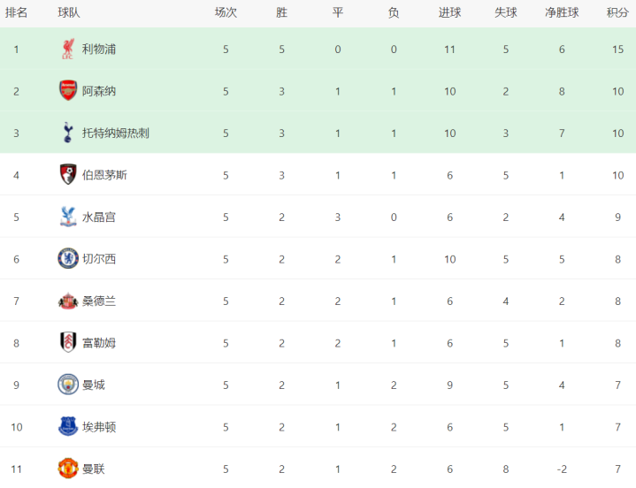 这一轮众多强队纷纷丢分,只有利物浦最稳。在积分榜上,5战全胜的利物浦以15分排名榜首。角逐 对手都丢分,利物浦扩大了领跑 优势。排名第2的是阿森纳2026世界杯小组赛,拿到10分。热刺和伯恩茅斯也都是10个积分。水晶宫9分排名第5。第6的是切尔西,只拿到8分。曼城2胜1平1负,只拿到7分,排名第9。曼联也是7分,排名第11。