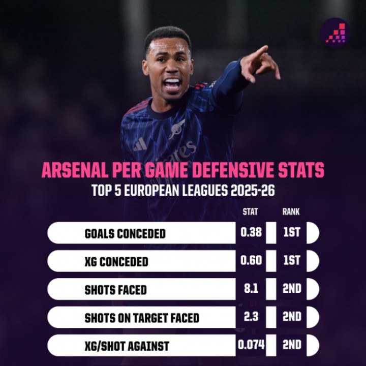数据统计 显示,阿森纳本赛季5项防卫 端关键数据均位列英超前二: