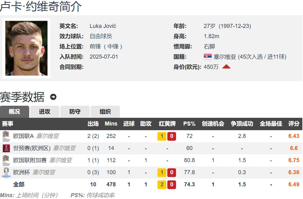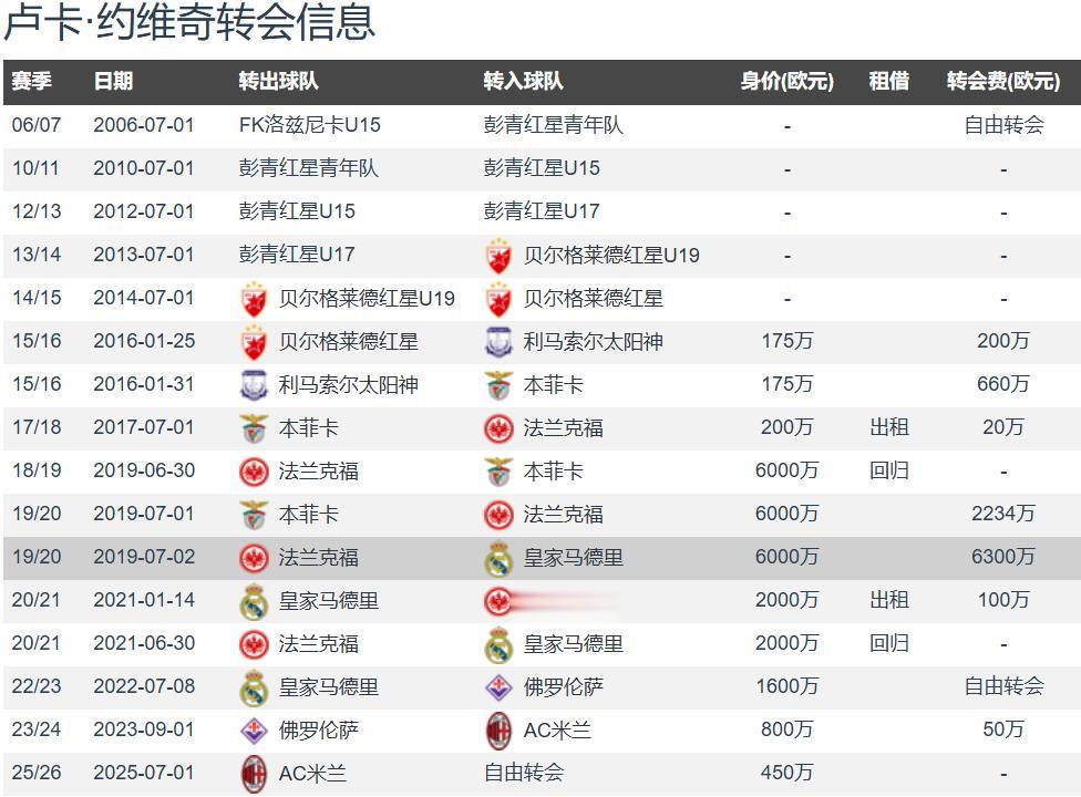 约维奇的高光时刻发生于2019年夏窗,当时21岁的他以6300万欧元的转会费从法兰克福加盟皇马,那时候约维奇在德转的身价高达6000万欧元,这也是约维奇职业生涯最高身价。加盟欧洲最大的豪门之后,约维奇完全找不到射球 靴,即使回租法兰克福也没有重拾信心,之后还在佛罗伦萨(2022年夏窗免签)和AC米兰(2023年夏窗50万欧元引进)踢过。约维奇皇马生涯51场3球5助,佛罗伦萨生涯50场13球3助,AC米兰生涯47场13球2助。